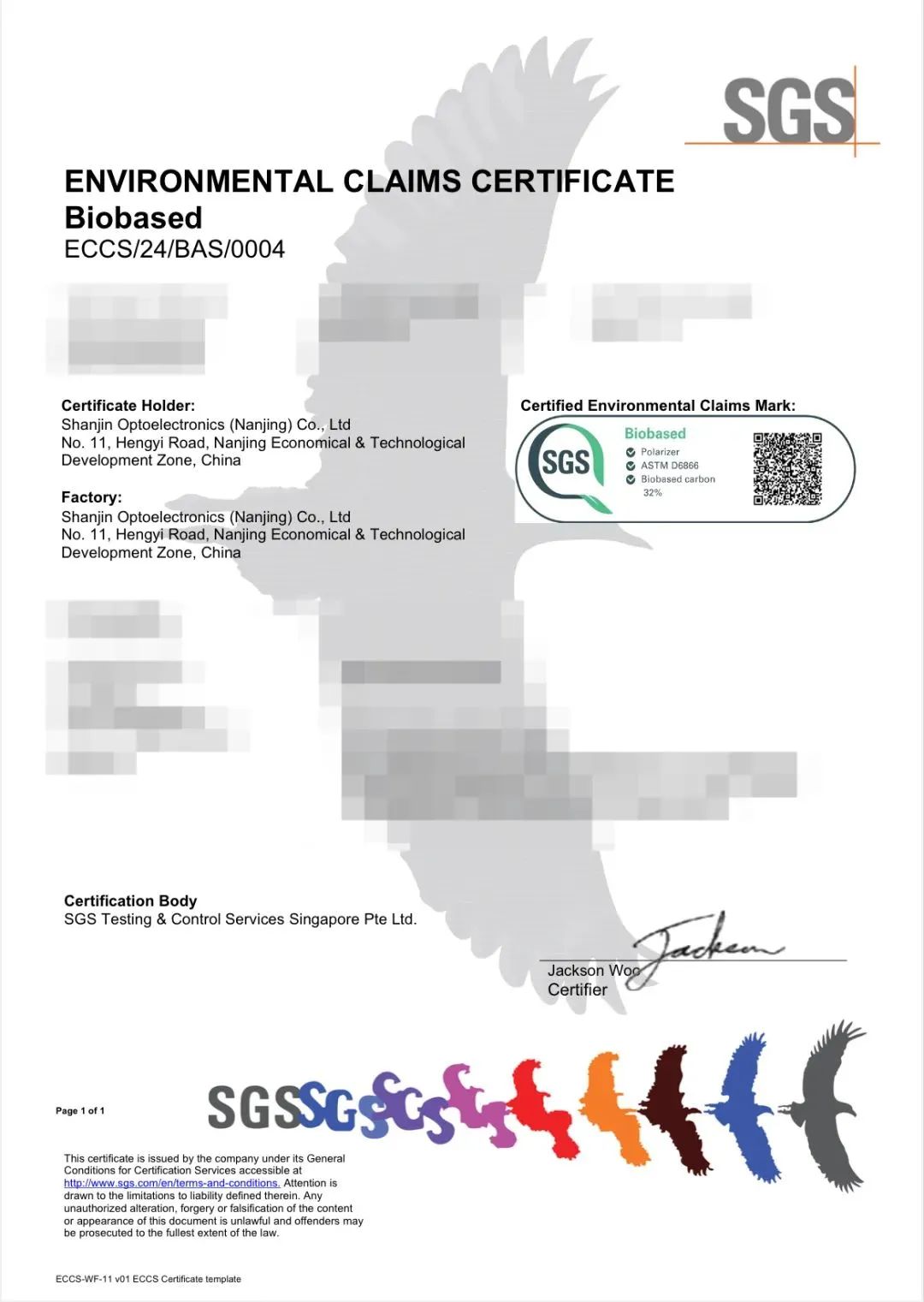 杉金光电始终把绿色理念贯穿于产品研发、生产和销售的各个环节。此次,公司自主研发的“Eco-Friendly Polarizer”产品凭借其高达32%的生物基碳含量,在环保领域取得了重大突破。这一创新产品的推出,不仅满足了市场对绿色环保产品的迫切需求,也增强了公司对ESG的承诺和在绿色产品开发领域的领先地位。