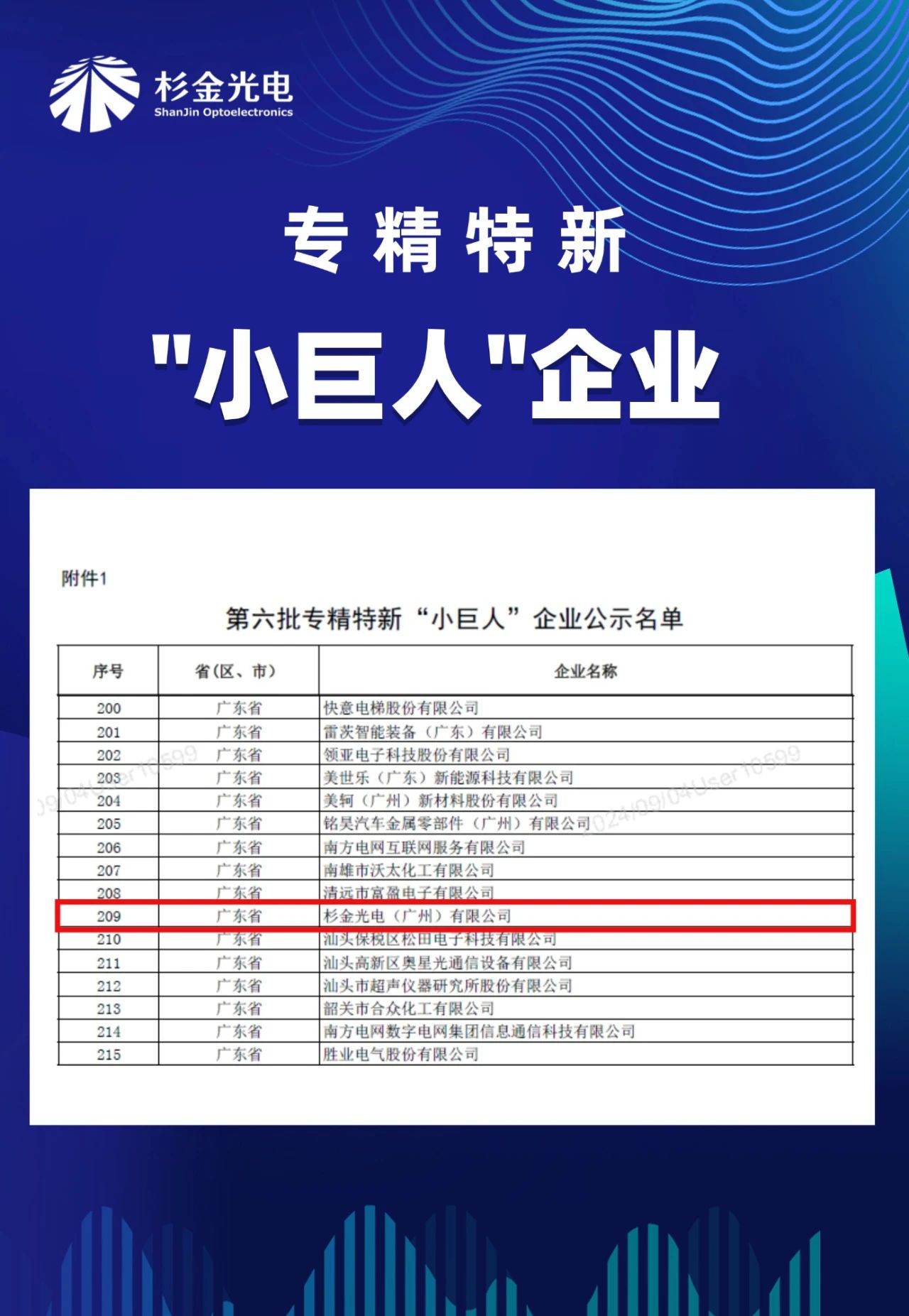 近日,广东省工业和信息化厅公示了最新一批专精特新“小巨人”企业名单,杉金光电广州公司荣列其中。